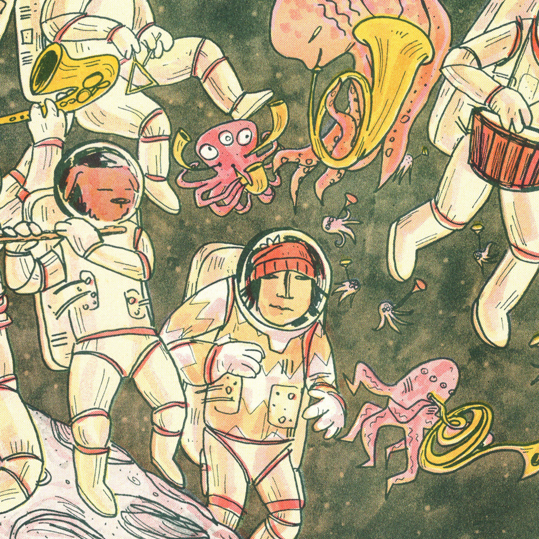 Riso printed on Munken Pure paper (150gsm) in red, hunter green and sunflower yellow.